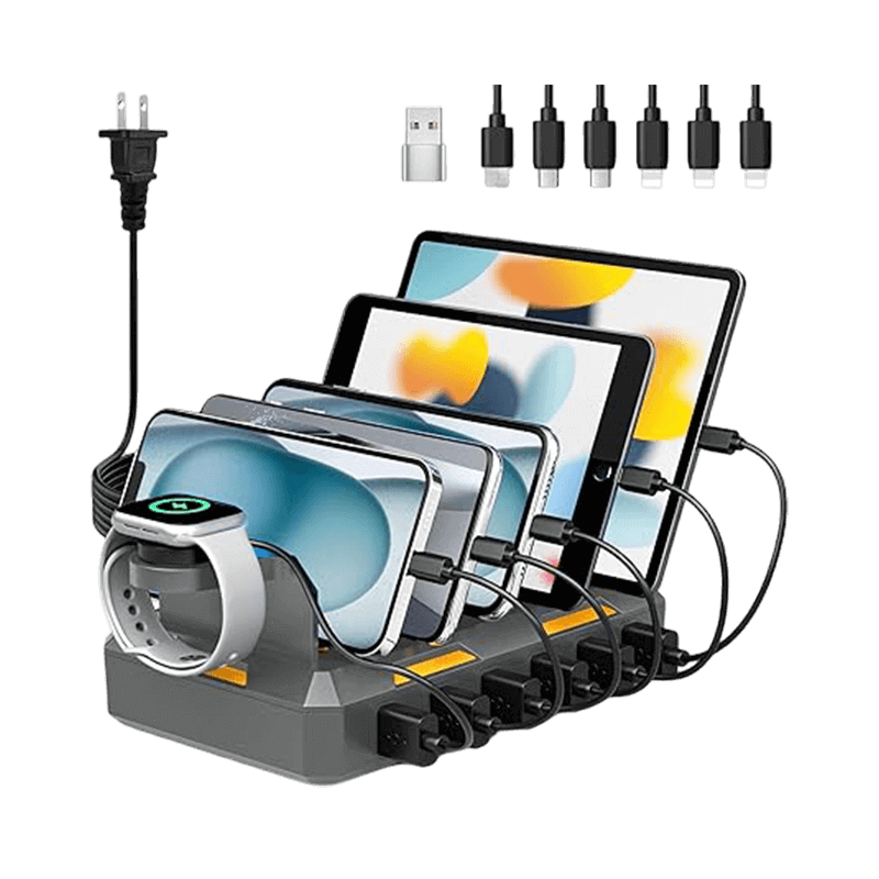 This compact USB-A charging station may help you neatly charge up to 6 devices simultaneously, offering a tidy solution to cable clutter. It comes with 6 cables, a smart watch charger holder (cable not included), and a Type-A to Type-C adapter. Delivering a maximum output of 2.4A per port, it may charge devices up to 80% faster than standard 2A chargers.