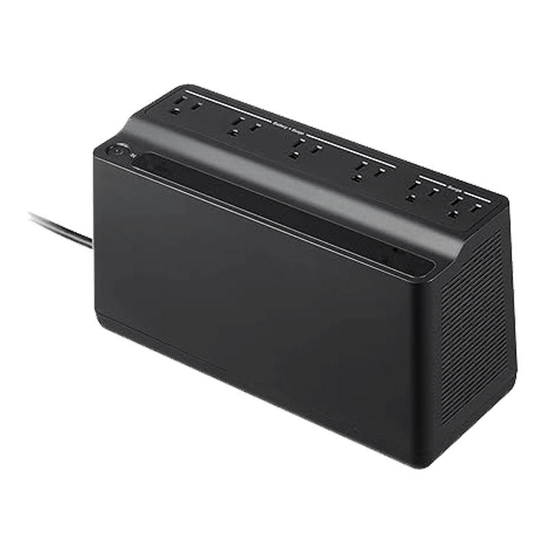 This battery backup power supply may help protect your essential electronics from power interruptions and surges. With a 425VA/225W capacity, it features six outlets: four that provide both battery backup and surge protection, and two dedicated to surge protection only. During an outage, it may help keep small critical devices like WiFi routers running. The unit includes a power cord with a right-angle plug, is wall-mountable.